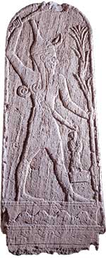 Baal au foudre de Ras Shamra Si les fouilles en Philistie n'ont encore révélé aucune représentation de ce dieu, nous en avons des centaines, par contre, dans tout le territoire de la Syrie-Palestine : il se tient presque toujours debout, brandissant une massue de la main droite (le tonnerre), et tenant un javelot enflammé (l'éclair) de la main gauche, comme le montre le bas-relief d'Ugarit reproduit ici. Les Philistins ont donc encore adopté un dieu local, celui de la fertilité, puisqu'il est le maître de l'orage et de la pluie. Voilà pour les dieux. Qu'en est-il des déesses? Un prochain numéro de Parabole nous le dira peut-être.