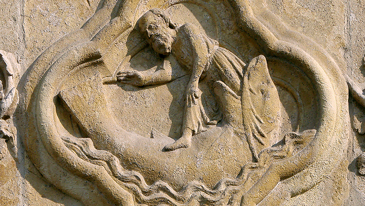 Jonas rejeté par le poisson. Bas-relief de la cathédrale d'Amiens (Wikimedia).