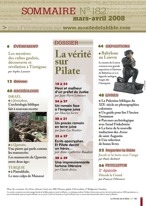 La vérité sur PilateNuméro 182 • mars-avril 2008 La figure de Pilate est passée dans la culture commune à travers quelques expressions (« Je m’en lave les mains ! ») et aussi comme le prototype du responsable hésitant qui finit par rallier l’avis du plus grand nombre. Son personnage intrigue, peut-être par son humanité de lâche pas vraiment antipathique. En 2002 encore, L’Évangile selon Pilate d’Éric-Emmanuel Schmitt a confirmé cette forme de popularité. Le Monde de la Bible esquisse un portrait du personnage, sous tous ses aspects: historique, juridique, littéraire et aussi théologique. Pour tenter de dissiper le mystère Pilate et répondre à cette question: pourquoi est-il devenu malgré tout – ou malgré lui – une sorte de héros ? |