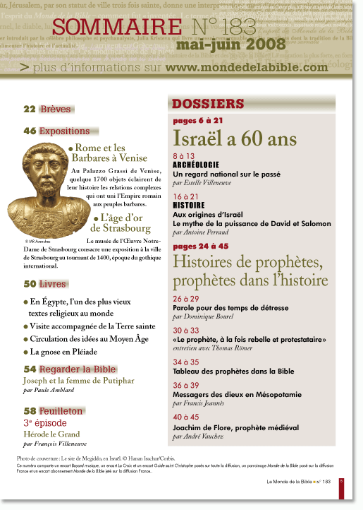 Israël : 60 ans et 3000 ans d'histoireNuméro 183 • mai-juin 2008 Le 14 mai 1948 à minuit (ou le 15 mai à 00 heure…), Ben Gourion proclamait Un regard national sur le passé HistoireAux origines d’Israël Histoires de prophètes, prophètes dans l’histoire« Puisse tout le peuple de l’Éternel être composé de prophètes, et veuille l’Éternel mettre son Esprit sur eux ! » Ce souhait de Moïse au livre des Nombres a accompagné toute l’histoire d’Israël. A-t-il pour autant été exaucé ? Le Monde de la Bible pose la question du rôle des prophètes dans l’Israël ancien et de leur héritage dans le christianisme et le judaïsme d’après la disparition du Temple. Parole pour des temps de détresse « Le prophète, à la fois rebelle et protestataire » Tableau des prophètes dans la Bible Joachim de Flore, prophète médiéval Regarder la BibleJoseph et la femme de Putiphar |
