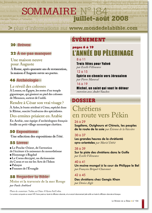 Des chrétiens vers pékin sur la route de la soieNuméro 184 • juillet-août 2008 Pour le meilleur et pour le pire, l'été 2008 sera chinois. La Chine ! Un univers, une civilisation où des chrétiens sont allés porter l'Évangile, dès le VIe siècle, sur les traces des caravanes qui transportaient la soie et les épices. Quoi qu'il advienne des jeux de Pékin, l'occasion se présente de retracer le pourquoi et le comment de cette aventure. EVENEMENTL’année du pèlerinage Des dizaines de milliers de pèlerins vont se rendre à Lourdes cette année pour le 150e anniversaire des apparitions de la Vierge à Bernadette. D’où vient cette tradition des pèlerinages vers des lieux considérés comme sacrés ? Le Monde de la Bible ouvre le dossier. Trois fêtes pour Yahvé Égérie en chemin vers Jérusalem Michel, un saint qui vaut le détour DOSSIERSogdiens, Ouïghours et Chinois, les peuples de la route de la soie Les grandes heures de la chrétienté syro-orientales Sur la piste des chrétiens dans le Golfe Un moine mongol à la cour de Philippe le Bel Des chrétiens chez Gengis Khan |