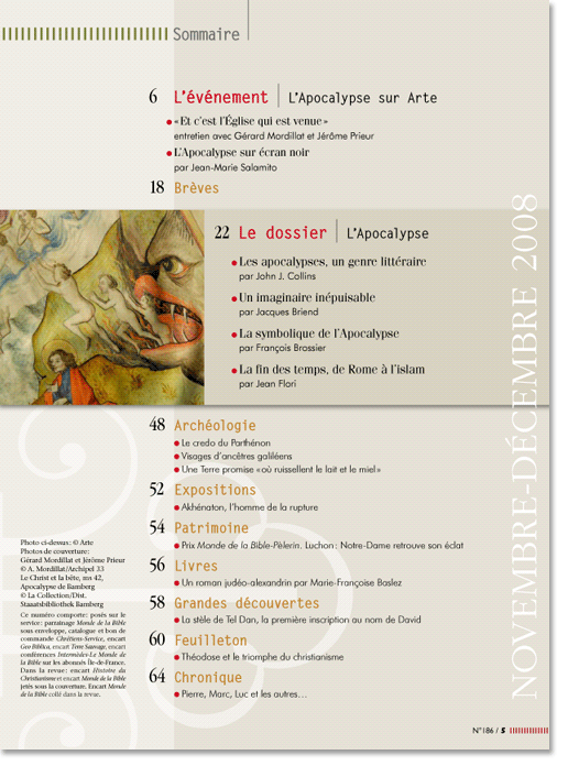 L'Apocalypse, attribuée à l'apôtre Jean, est un livre déroutant et un peu effrayant. Ésotérique et quasi incompréhensible pour les uns, il est source de fantasmes sur une annonce codée du cours de l’histoire pour les autres. Le Monde de la Bible propose un décryptage de l'Apocalypse en forme de démythification, sans rien ôter à la poésie du texte, à sa puissance théologique et à la beauté des représentations qu’il a inspirées.