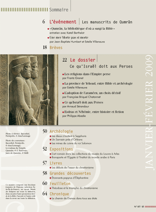 Les années perses d'Israël (538-333)Numéro 187 • janvier-février 2009 Pendant plus de deux cents ans, entre 538 et 333 avant J.-C., la province de Juda a vécu au sein du puissant Empire des Perses achéménides. Une période faste, semble-t-il, après les affres de l'Exil, pour l'édification nationale et religieuse d'Israël. Dans quelle mesure la tutelle perse a-t-elle favorisé ce dynamisme? Entre ce qui deviendra l'Iran et l'État hébreu d'aujourd'hui, quel passé la recherche historique récente met-elle en lumière? ÉVÉNEMENTLes manuscrits de Qumrân « Qumrân, la bibliothèque d’où a surgi la Bible » Une mer Morte pas si morte DOSSIER : L'ApocalypseCe qu’Israël doit aux Perses Les religions dans l’Empire perse La province de Yehoud, entre Bible et archéologie L’adoption de l’araméen, un choix décisif Ce qu’Israël doit aux Perses Esdras et Néhémie, entre histoire et fiction |
