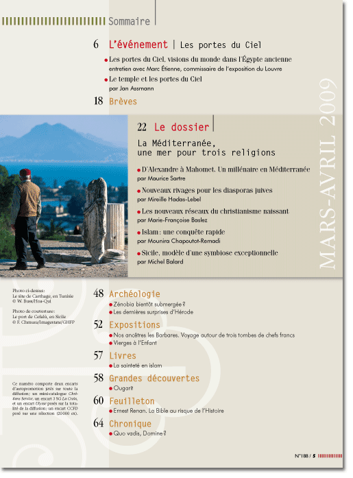 Méditerrannée : une mer pour trois religionsNuméro 188 • mars-avril 2009 En désignant la Méditerranée sous le nom de Mare Nostrum, « Notre mer », les anciens Romains étaient déjà bien conscients de la diversité humaine qui se partageait ses rives. Trois grandes religions venues d’Orient s’y sont déployées, poussées chacune par des motivations et un élan propre. Quand? Comment? Tel sera le thème du dossier de ce numéro! Un précieux éclairage sur l’histoire de la cohabitation en Méditerranée, à l’heure où les politiques tentent de recréer une dynamique commune. ÉVÉNEMENT : Les portes du CielLes portes du Ciel, visions du monde dans l’Égypte ancienne Le temple et les portes du Ciel DOSSIER : La Méditerranée, une mer pour trois religionsD’Alexandre à Mahomet. Un millénaire en Méditerranée Nouveaux rivages pour les diasporas juives Les nouveaux réseaux du christianisme naissant Islam: une conquête rapide Sicile, modèle d’une symbiose exceptionnelle Archéologie Zénobia bientôt submergée ? ExpositionsNos ancêtres les Barbares. Voyage autour de trois tombes de chefs francs LivresLa sainteté en islam Grandes découvertesLes tablettes cananéennes d'Ougarit FeuilletonErnest Renan. La Bible au risque de l’Histoire ChroniqueQuo vadis, Domine ? |