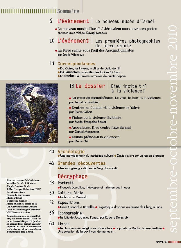 Dieu incite-t-il à la violence ?Numéro 194 • septembre-octobre-novembre 2010 Les religions – en particulier le judaïsme, le christianisme et l’islam – sont souvent pointées du doigt comme sources de conflits et de haine. Leur principe monothéiste tendrait à éliminer tout adversaire du seul Vrai Dieu, et leurs Écritures saintes inciteraient explicitement à «passer à l’acte». L’accusation est-elle légitime ? Sans entrer dans les implications morales du débat, Le Monde de la Bible a voulu y voir clair en consultant directement l’histoire et les textes. Jean-Luc Pouthier, historien, a donc enquêté sur les effets du monothéisme dans l’histoire, en termes de violence. Le théologien Pierre Gibert, l’historienne Marie-Françoise Baslez et l’exégète Daniel Marguerat se sont penchés sur l’histoire biblique et les épisodes les plus problématiques de l’Ancien et du Nouveau Testament : le comportement de Yahvé dans le récit de l’entrée des Hébreux en Canaan ; le cas du meurtrier Pinhas donné en exemple de zèle religieux contre les Grecs et les Romains ; la violence de l’Apocalypse de saint Jean, brandie contre la violence. Enfin, l’islamologue Denis Gril a resitué le jihâd dans le Coran et la tradition musulmane. En conclusion ? Il paraît difficile de nier la présence d’appels à la violence dans les Écritures monothéistes ; mais ce dossier nous rappelle qu’ils s’inscrivent toujours dans un discours et un contexte historique précis, dont il faut tenir compte sous peine de contresens grave. |