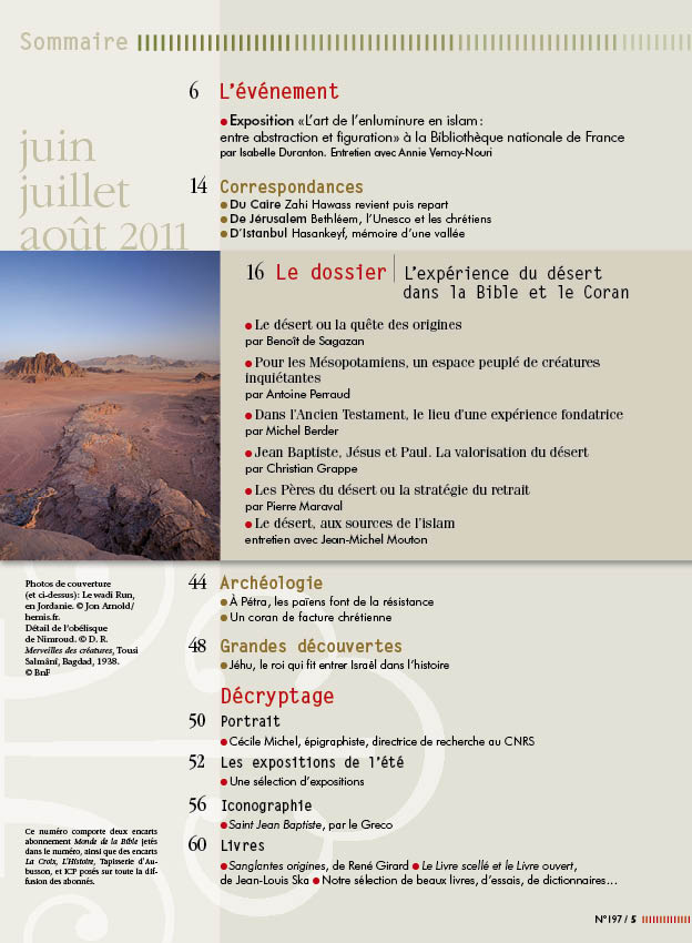 L'expérience du désert dans la Bible et le CoranNuméro 197 • juin-juillet-août 2011 Des centaines de nos contemporains, croyants ou non, tentent chaque année l’expérience du désert. Que vont-ils y chercher? Comme si ce milieu, hostile à l’homme, pouvait agir comme un «révélateur». Révélateur de l’homme à lui-même, à ses origines, à un Dieu? Mais n’est-ce pas au désert que se sont forgés les grands monothéismes? Lorsque Pierre Loti entreprend sa traversée du Sinaï en 1894, il a l’intention d’aller jusqu’en Terre sainte, sa bible en poche. C’est notamment pour lui l’occasion de lire ou relire le livre de l’Exode, mais il accomplit ce périple ni en pèlerin, ni en croyant. Loin s’en faut. Ainsi, parvenu au mont Sinaï, il écrit dans son récit de voyage, intitulé Le désert, « Hélas, comme elle est silencieuse, sinistre et froide cette apparition de la montagne très sainte, dont le nom, à distance, flamboyait encore pour nous. Les temps sont trop lointains, sans doute, trop dévolus à jamais, où l’Éternel y descendit dans les nuées de feu, au son terrible des cors; fini, tout cela, elle est vide à présent, comme le ciel et comme nos modernes âmes; elle ne renferme plus que de vains simulacres glacés, auxquels les fils des hommes auront bientôt cessé de croire […] » Malgré tout, la traversée du désert l’entraîne vers une méditation sur les origines : « Les montagnes sont de sable, d’argile et de pierres blanches: amas de matières vierges, entassées là au hasard des formations géologiques, jamais dérangées par les hommes, et lentement ravinées par les pluies, lentement effritées par les soleils, depuis les commencements du monde. » Une méditation qui fait écho à l’origine telle que l’a décrit le livre de la Genèse (1, 4b-5) : « Au temps où Yahvé Dieu fit la terre et le ciel, il n’y avait encore aucun arbuste des champs sur la terre et aucune herbe des champs n’avait encore poussé, car Yahvé Dieu n’avait pas fait pleuvoir sur la terre et il n’y avait pas d’homme pour cultiver le sol. » Ce milieu reste hostile à l’écrivain voyageur et terriblement angoissant. Ce territoire est pour lui celui de la mort. « Ici c’est la stérilité et la mort. » Mais, ajoute-t-il, « On est comme grisé de silence et de non-vie, tandis que passe un air salubre, irrespiré, vierge comme avant la création. » C’est une toute autre relation avec le désert qu’a entretenu durant toute une vie le naturaliste Théodore Monod (1902-2000). Depuis 1923, il n’a cessé de sillonner le Sahara. Dans Pèlerin du Désert (1999), il confie : « J’ai eu la chance de rencontrer le désert, ce filtre, ce révélateur. Il m’a façonné, appris l’existence. Il est beau, ne ment pas, il est propre. C’est pourquoi il faut l’aborder avec respect. Il est le sel de la Terre et la démonstration de ce qu’ont pu être la naissance et la pureté de l’homme lorsque celui-ci fit ses premiers pas d’Homo erectus […] » Le scientifique y a aussi mené une quête spirituelle. Qu’ils se nourrissent d’Antoine de Saint-Exupéry, de Charles de Foucauld, de la Bible ou des Pères du désert, ces voyageurs semblent partager pour le moins une expérience humaine commune : la confrontation à la solitude, au groupe sans lequel on n’est plus rien, à soi-même… Le désert semble agir comme un révélateur, dit Monod. Et il n’est sans doute pas indifférent que les trois grands monothéismes, le judaïsme, le christianisme et l’islam, aient été eux aussi façonnés par l’expérience du désert. C’est que nous avons voulu explorer dans ce dossier en interrogeant tout d’abord la civilisation assyrienne sur sa relation au désert, et les bédouins préislamiques qui y vivaient. Puis en questionnant la Bible et plus particulièrement le livre de l’Exode pour connaître cette expérience fondatrice du judaïsme au Sinaï. En interrogeant ensuite dans le Nouveau Testament les expériences de Jean Baptiste, de Jésus et de l’apôtre Paul, avant de saisir la motivation des premiers moines chrétiens « dans leur désir de désert ». Enfin, en discernant dans le Coran et l’histoire des premiers musulmans à quel point l’islam est né « du » désert. Présentation du dossier par Benoît de Sagazan |