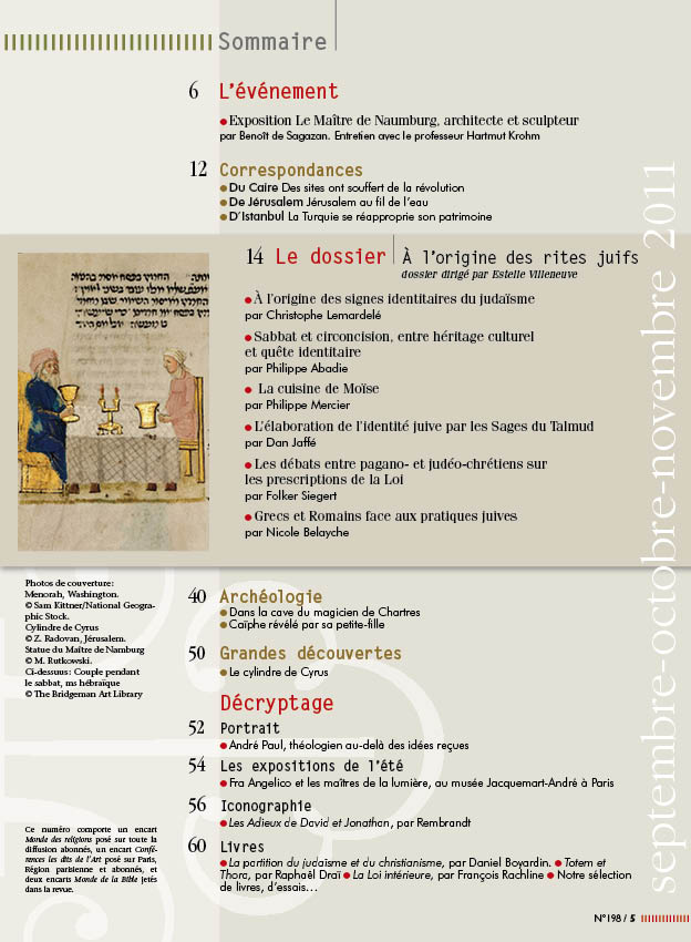 À l'origine des rites juifsNuméro 198 • septembre-octobre-novembre 2011 Les questions d’identité ne cessent de travailler nos sociétés et les débats autour des signes religieux de se radicaliser. Au nom de sa vocation à éclairer les racines bibliques de notre culture à la lumière des études récentes, Le Monde de la Bible ne pouvait rester à l’écart de ces débats. Nous nous sommes donc interrogés sur l’origine des « marqueurs » de l’identité juive, nous limitant aux emblématiques : la circoncision, le sabbat et les interdits alimentaires. Nous commencerons par un tour d’horizon de ces pratiques chez les voisins d’Israël (Christophe Lemardelé). Il permettra de saisir la singularité de la relecture théologique du sabbat et de la circoncision par les rédacteurs de la Torah au moment de la reconstruction nationale après la crise de l’Exil (Philippe Abadie) et la théologie « nourrissante » de la vie qui se profile derrière les interdits alimentaires (Philippe Mercier). Nous mesurerons aussi le rôle de la tradition rabbinique dans la survie d’une identité juive condamnée à disparaître après la fin du Temple en 70 ap. J.-C. (Dan Jaffé). Puis nous examinerons l’attitude des premières communautés chrétiennes concernant les observances mosaïques (Folker Siegert). Enfin, nous verrons comment l’Antiquité |