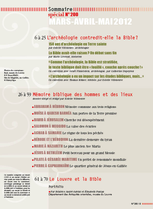L’archéologie contredit-elle la Bible?Numéro 200 • mars-avril-mai 2012 La question n’en finit pas d’agiter les consciences, suscitant d’éternelles oppositions entre tradition et raison. Elle peut aussi troubler les croyants. Fort de sa mission d’intelligence des textes (et de la foi) et de décryptage de la culture biblique, Le Monde de la Bible s’en est emparé de front afin d’y apporter les réponses les plus pertinentes. Pour y parvenir, nous avons sollicité les experts les plus qualifiés et les plus renommés, et nous leur avons posé les questions suivantes : Depuis quand cette question se pose-elle avec tant de vigueur chez les archéologues ? (Estelle Villeneuve) ; Comment a-t-elle résonné dans le travail de l’historien du Proche-Orient ? (Mario Liverani) ; Comment est-elle vécue par un de ses acteurs les plus médiatiques ? (Israël Finkelstein) ; Quelle réaction, enfin, suscite-t-elle chez les biblistes eux-mêmes ? (Thomas Römer) À l’heure de célébrer son trente-cinquième anniversaire et la publication de son numéro 200, ce débat vaut la peine d’être mené dans une revue dont l’exégèse, la critique historique et l’archéologie forment les principaux piliers de sa matière éditoriale. |