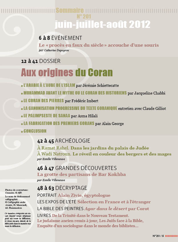 Aux origines du CoranNuméro 201 • juin-juillet-août 2012 Peut-on appliquer au Coran, Livre saint des musulmans, les mêmes méthodes d’analyse, notamment historico-critiques, sémiologiques, philologiques, épigraphiques… que des générations de chercheurs universitaires occidentaux utilisent pour l’étude des textes de la Bible ? Compte tenu de la fécondité de longues décennies d’exégèse biblique, nous voulons croire qu’elle soit tout aussi profitable aux études du Coran et de l’islam. Le Coran, son histoire et les plus anciens textes coraniques posent aux chercheurs de nombreuses questions. Que sait-on de l’Arabie préislamique de Muhammad lui-même ? Que peut-on dire du processus de mise par écrit du Coran et des plus anciens textes connus ? Quels rôles ont pu jouer des juifs et des chrétiens dans ce processus ? Existe-il un Coran des origines différent de celui que nous connaissons aujourd’hui ? Que dit le Coran des pierres, ou ces graffiti laissés par les pèlerins vers La?Mecque, dès les premiers temps de l’islam ? Ces questions ne manquent pas d’intérêt. Toutes ne sont pas résolues. Mais les réponses, les interrogations nouvelles et hypothèses avancées bousculent un certain nombre d’idées reçues sur le sujet. Et sans doute à la fin de la lecture de ce dossier, serez-vous persuadés du fait que le Coran intéresse également ceux que la Bible intéresse… |