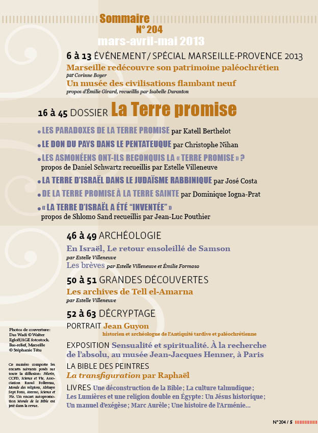 La Terre promise : paradoxes et interprétationsNuméro 204 • mars-avril-mai 2013 La « Terre promise » est de ces notions, à la fois vagues et familières, que Le Monde de la Bible aime approfondir, car elles puisent leurs racines dans la Bible et ne cessent de travailler nos représentations… jusque dans l’actualité la plus disputée. Terrain glissant, nous a-t-on avertis, et l’on songe aux réactions provoquées par le dernier livre de l’historien Shlomo Sand, Comment la terre d’Israël fut inventée. Terreau fertile, préférons-nous penser, dans lequel peut aussi germer une écoute apaisée! C’est donc à une séance de labour – dans l’histoire de la pensée religieuse, juive et chrétienne – que nous vous invitons au fil de ces pages! Avec l’historienne Katell Berthelot, nous envisagerons la « promesse » biblique à travers ses non-dits et les interprétations qu’ils ont suscitées. L’exégète Christophe Nihan nous fera entendre la polyphonie des textes bibliques, témoins de milieux et de préoccupations divers. Nous interrogerons ensuite Daniel Schwartz, historien de la Judée antique, pour savoir comment la notion de Terre promise a influencé (ou non!) la politique de conquête des rois asmonéens et hérodiens. José Costa, spécialiste de littérature talmudique, nous introduira aux réflexions des rabbins sur la terre dont ils étaient alors dépossédés, tandis que son collègue Simon Mimouni évoquera le cas particulier de Jérusalem. Enfin, le médiéviste Dominique Iogna-Prat nous expliquera comment l’Occident latin a reformulé le concept de Terre promise en Terre sainte, selon sa théologie propre. Devant un tel panorama, aussi vaste que les attentes d’un peuple croyant devant l’histoire, la Terre promise prend sa juste mesure. |