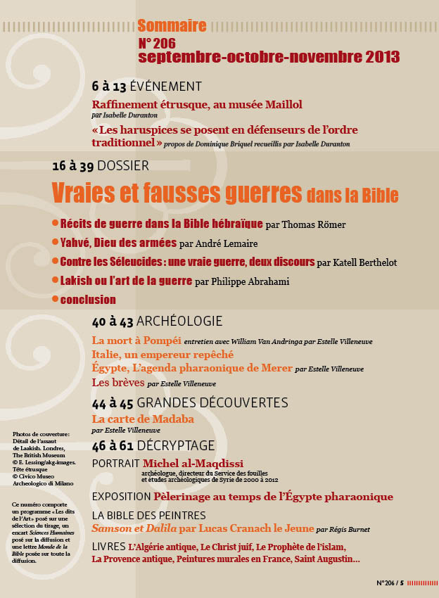 Vraies et fausses guerres dans la BibleNuméro 206 • septembre-octobre-novembre 2013 Pour ce dossier du Monde de la Bible, nous nous sommes laissé guider par le thème de la guerre, choisi par les organisateurs des Rendez-vous de l’histoire de Blois pour leur 16e édition, du 10 au 13 octobre 2013. Sujet pertinent tant la guerre est présente dans la Bible… n’en déplaise aux rêveurs qui cultivent les clichés iréniques sur les textes fondateurs de religion ! Certes, la guerre biblique n’est pas théorisée comme voie d’accès au salut, il n’empêche, Israël, en tant qu’entité théologique, s’enracine dans la Realpolitik de deux petits États du Proche-Orient ancien, Israël et Juda, qui ont dû jouer des coudes pour se faire une place et survivre après leur dissolution. S’étonnera-t-on alors que la Bible résonne de conquêtes, de conflits armés, de résistance à l’envahisseur… ? Pourtant, l’archéologie et l’exégèse historico-critique ont montré que les rédacteurs bibliques en avaient un peu rajouté et que la guerre, dans la Bible, relevait parfois plus du discours que des faits. Tel est le paradoxe que nous avons souhaité éclairer ici. L’exégète Thomas Römer (Collège de France, Paris) introduit le sujet en nous expliquant la place de la guerre dans la rhétorique biblique, entre nécessité et propagande politique. L’épigraphiste André Lemaire (École pratique des hautes études, Paris) nous présente Yahvé, le dieu d’Israël, dans ses fonctions primitives de dieu de la guerre. L’historienne Katell Berthelot (CNRS, Aix-en-Provence) décrypte le cas de la guerre dite « des Maccabées » qui opposa les Judéens aux rois séleucides au IIe siècle av. J.-C. pour lequel nous disposons de deux récits aux orientations idéologiques sensiblement différentes. Enfin, l’assyriologue Philippe Abrahami (CNRS, Lyon) décrit le siège de Lakish de 701 av. J.-C., une « vraie » guerre dont nous avons l’écho des deux belligérants, judéens et assyriens. Avec ces auteurs, laissons-nous entraîner sur les sentiers de la guerre, avec pour seule arme une intarissable soif de savoir… |