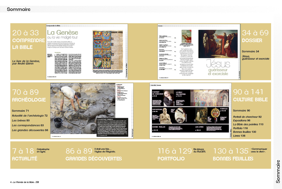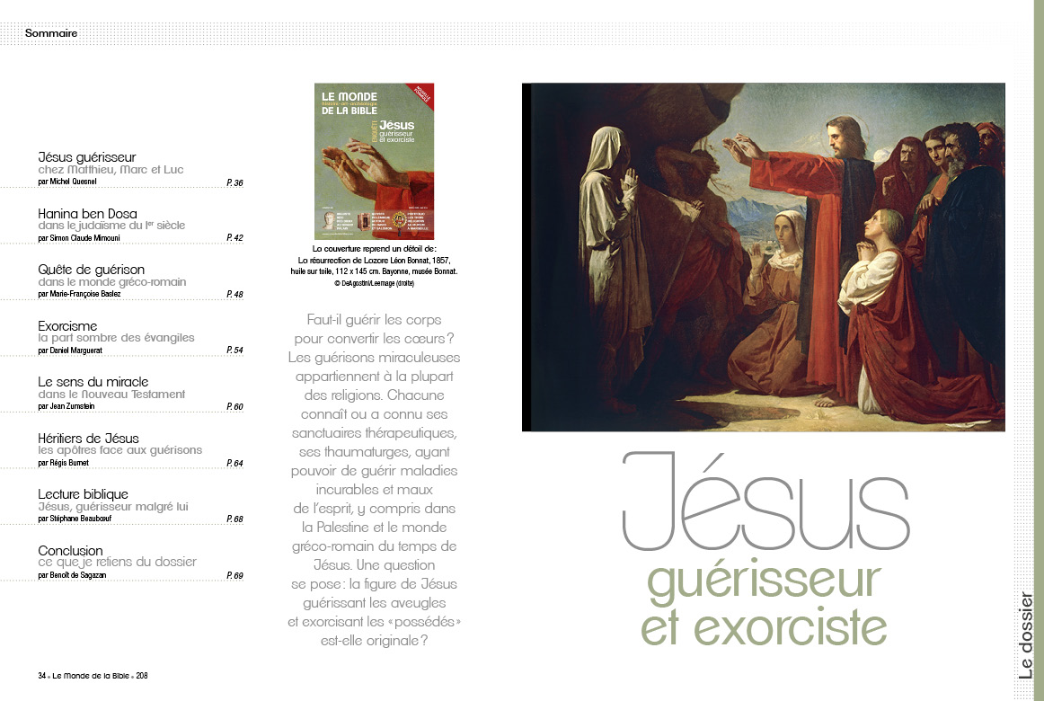 Jésus guérisseur et exorcisteNUMÉRO 208 • mars/avril/mai 2014 Jésus guérisseur et exorciste : faut-il guérir les corps pour convertir les cœurs? Les guérisons miraculeuses appartiennent à la plupart des religions. Chacune connaît ou a connu ses sanctuaires thérapeutiques, ses prêtres ou ses prophètes thaumaturges, ayant pouvoir de guérir maladies incurables et maux de l’esprit. Après avoir visité les pratiques thérapeutiques dans le monde gréco-romain et distingué les figures de guérisseurs, leurs sites et leurs cultes, dans le monde juif des Ier et IIe siècles, une question se pose : La figure de Jésus guérissant les aveugles et les paralytiques, exorcisant les possédés et ressuscitant les morts est-elle originale? L’exorcisme ne révèle-t-il pas une part sombre des Évangiles? A quelle fin les évangélistes insistent-ils sur ces miracles? Enfin il sera intéressant de comprendre comment les héritiers de Jésus, les disciples de la première génération, investis eux aussi du charisme ou du pouvoir de guérisons, en ont usé… Pour répondre à toutes ces questions, Le Monde de la Bible a convoqué à la barre les meilleurs spécialistes, historiens, exégètes et archéologues. Participent à cette enquête : Michel Quesnel (Lyon), Simon Mimouni (Paris), Emmanuel Friedheim (Tel Aviv), Marie-Françoise Baslez (Paris), Daniel Marguerat (Lausanne), Jean Zumstein (Zurich), Régis Burnet (Louvain). À signaler dans ce numéro (NDLR) :Comprendre la Bible, une nouvelle rubrique propose des clés de lecture d’un des livres de l’Ancien ou du Nouveau Testament. André Wénin, professeur d’Ancien Testament à l’Université catholique de Louvain, inaugure la rubrique avec une lecture du livre de la Genèse. Nous attirons également votre attention sur l’article « David en ballotage à Khirbet Qeiyafa » (rubrique Archéologie) introduit comme suit : « Pour résoudre la polémique qui divise historiens et archéologues, à propos des origines d’Israël et de l’existence du royaume de David, le petit site de Khirbet Qeiyafa, au pied des collines de Judée, présente bien des atouts. Au terme de la septième campagne de fouilles, de quel côté de la Bible penche aujourd’hui la balance : celui de la lecture traditionnelle ou de la critique moderne? » |