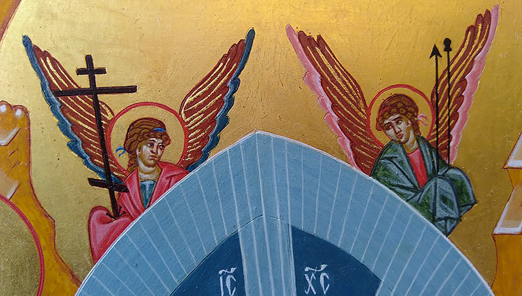 Dans toute icône, chaque détail, chaque couleur, chaque personnage, chaque ligne de vêtements, d’architecture et d’accessoires a son importance et son symbolisme. Autre détail sur cette icône, la grande bordure et le fond de l’icône est dorée à la feuille d’or véritable. Mais la toute dernière bordure sur toutes les icônes est toujours rouge et symbolise la présence de l’Esprit Saint. De plus dans les icônes, il n’y a jamais d’ombre. C’est que dans les icônes, la lumière émane de l’intérieur des personnages. Nous sommes dans une autre dimension de l’être et de l’espace.