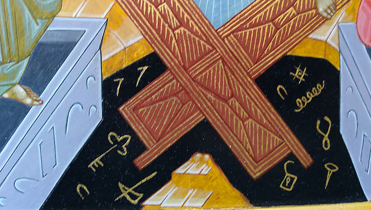 Les deux anges au-dessus du Christ portent, dans leurs mains couvertes, les supplices de sa passion : la croix, les lances, les clous. En dessous complètement, on se rend bien compte que les portes du gouffre ont été défoncées. On aperçoit dans le noir des serrures, des clefs, des ressorts, bref tout a été cassé, tout a été brisé : « Les portes de bronze se fracassèrent, et les barres de fer se rompirent et tous les morts furent déliés des chaînes qui les retenaient, et nous avec eux. Et le roi de gloire entra, sous l’aspect d'un homme, et les ténèbres de l’enfer devinrent éblouissantes. » (Actes de Pilate 21,3) La libération est commencée. La descente aux enfers symbolise l’abaissement suprême du Christ avant son relèvement.
