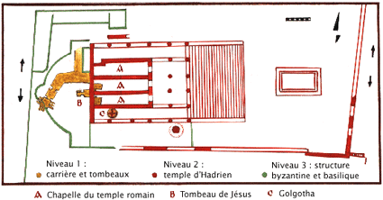 Un tombeau enseveliOn le sait maintenant (voir la chronique précédente). Le tombeau de Jésus se trouve à l'intérieur des remparts de Jérusalem, à partir de l'an 44 de notre ère. De ce fait, il subit les contrecoups du développement urbain et surtout les effets dévastateurs des guerres romaines. La ville s'est peu construite autour du tombeau vu le caractère accidenté d'anciennes carrières. Le lieu du gibet et de la sépulture de Jésus a dû ainsi rester visible. ÉpargnéPar contre, deux guerres romaines ont laissé de profondes cicatrices dans la Ville sainte. La première, dirigée par Titus en 70, a transformé Jérusalem en un gigantesque monceau de ruines. La région du Temple et du palais d'Hérode le Grand fut particulièrement touchée. Le tombeau de Jésus se trouvait à mi-chemin entre ces deux zones de destruction. Il ne devait pas attirer l'attention, vu la discrétion de la communauté chrétienne. Rome domine sévèrement sur toute la Palestine pendant une soixantaine d'années (70-132). C'est au cours de cette période que les évangélistes rédigent leurs récits de la passion et de la résurrection du Seigneur. Sur les détails des lieux de la crucifixion et de la sépulture, leurs témoignages concordent. Ces lieux étaient donc toujours connus, et visibles. En 132, soulèvement des Juifs que Rome ne tarde pas à mâter. Pour écarter tout risque de nouvelle révolte, Hadrien fait raser Jérusalem; il expulse les Juifs et les Arabes leur interdisant l'approche de la ville dans un rayon de cinq milles. Une autre décision impériale vise à tuer dans l'oeuf toute révolte éventuelle: c'est la reconstruction à la romaine de la Ville sainte. Son nouveau nom d'Aelia capitolina lui vient du Capitole de Rome où siège le panthéon. Un nom latin bien justifié, puisque des lieux de culte romains remplacent tous les lieux de culte juifs démolis. Ainsi, l'empereur fait raser jusqu'au roc l'emplacement du Saint des Saints du Temple. Il y dresse ensuite la statue de Jupiter, chef du panthéon, et sa propre statue, le divin Hadrien! EnfouiFait remarquable: dans la zone de carrières et de tombeaux où devrait se situer la tombe de Jésus, Hadrien élève une immense esplanade, ou forum, après avoir nivelé et remblayé ce secteur très accidenté. Dans la partie ouest de l'esplanade, il érige un temple en l'honneur des trois grands dieux de Rome: Jupiter, Junon et Vénus! Quel lieu de culte veut-il supprimer à cet endroit? On ne peut penser qu'au Sépulcre ou au Golgotha! Ces dernières années, des travaux de restauration de l'église du Saint-Sépulcre ont contraint les architectes à vérifier l'état de ses fondations. On s'est vite rendu compte que l'édifice chrétien repose en partie sur les ouvrages d'Hadrien, inconnus jusqu'alors (voir le plan). Les lignes noires pleines indiquent ces ouvrages encore existants: on remarque le gros mur de l'esplanade (Temenos), et le temple à trois chapelles, à l'ouest, au-dessus d'une tombe que l'on veut dissimuler! Là devaient se réunir les fidèles pour la célébration de rites qu'Hadrien veut bannir! L'action d'Hadrien fut efficace. Les juifs n'ont jamais reconstruit le Temple de Jérusalem. Pour ce qui est de l'emplacement de la tombe de Jésus, en 326, Constantin ordonna d'y construire son Agia Anastasis (« Sainte Résurrection »). Depuis Hadrien jusqu'à Constantin, il faut noter le silence absolu qui plane sur cette tombe. Au moins quatre récits de pèlerins datent de cette période. À ces pèlerins, on montre divers lieux où Jésus a enseigné ou opéré quelque miracle; jamais on ne leur présente un Golgotha ni un Sépulcre. Ou bien ces lieux sont inconnus -- ce qui est peu probable --, ou ils sont présentement invisibles et même inaccessibles! Un temple romain les dissimule. Après l'histoire, que nous révélera l'archéologie?