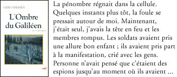 Parvient-il à le relever? Il s'agit là d'une excellente tentative d'initier des non-spécialistes. Certes, il ne faut guère s'étonner que le souci de Theissen d'illustrer le contexte social de l'époque de Jésus préoccupe davantage le professeur que l'auteur. C'est pourquoi certains dialogues apparaissent quelque peu artificiels par la somme de détails accumulés. Néanmoins, ils peuvent refléter certains des soucis et des traits d'un jeune Juif du premier siècle. De plus, ses conclusions à la fin de chaque chapitre adressé à un mystérieux collègue, un certain M. Kratzinger, permettent, par cet artifice littéraire, de résumer et de faire ressortir l'essentiel de chacun des chapitres tout en introduisant ses lectrices et lecteurs aux méthodes exégétiques. Finalement, les nombreuses notes en bas de page lui permettent de préciser une information ou de développer d'autres éléments qui auraient alourdis la lecture du roman. Le plus grand mérite de ce livre est de présenter l'univers de Jésus Nazareth et de nous y plonger de manière vivante. Theissen est parvenu, de façon dynamique, à situer certains des enjeux primordiaux du message de Jésus au sein de son contexte. Par exemple : André faisant son rapport à Pilate, tente de minimiser le geste de Jésus au Temple. La réponse de Pilate illustre bien comment l'Empire romain pouvait interpréter les paroles et gestes tant de Jésus que des premières communautés chrétiennes : André : « Un des premiers principes de Jésus, c'est de ne pas s'opposer au méchants : si quelqu'un frappe sur la joue droite, on doit tendre la joue gauche. Qui dit cela ne peut être dangereux! » Cet extrait fait référence aux orientations de vie de Jésus et de son mouvement qui questionnent le fondement même de l'Empire : la hiérarchisation entre les gens, l'esclavage et l'oppression politique. C'est pour cette raison qu'un tel discours pouvait comporter des éléments encore plus révolutionnaires voire subversifs que celui des zélotes. Conclusion L'originalité et l'attrait du livre résident dans la tentative réussie de joindre l'information scientifique et le genre romanesque. Cette approche possède l'immense avantage de bien décrire des mouvements sociaux du premier siècle. C'est pourquoi, ce roman s'avère si intéressant. En effet peu d'oeuvres dévoilent avec autant de précisions l'univers du premier siècle. Cette force en éclipse les quelques faiblesses. Si des lectrices et lecteurs désirent s'initier au monde de Jésus, c'est sans doute l'un des meilleurs romans pour plonger au coeur de la Palestine du premier siècle. Il est d'autant plus pertinent qu'André, tout comme nous, ne rencontre jamais Jésus mais entre dans le processus de recherche qui le conduit à découvrir et à relire le message et la vie de Jésus de Nazareth. C'est l'invitation que Theissen fait à tout lectrice et lecteur avec L'Ombre du Galiléen. Patrice Perreault